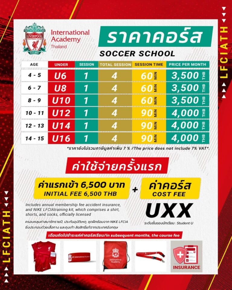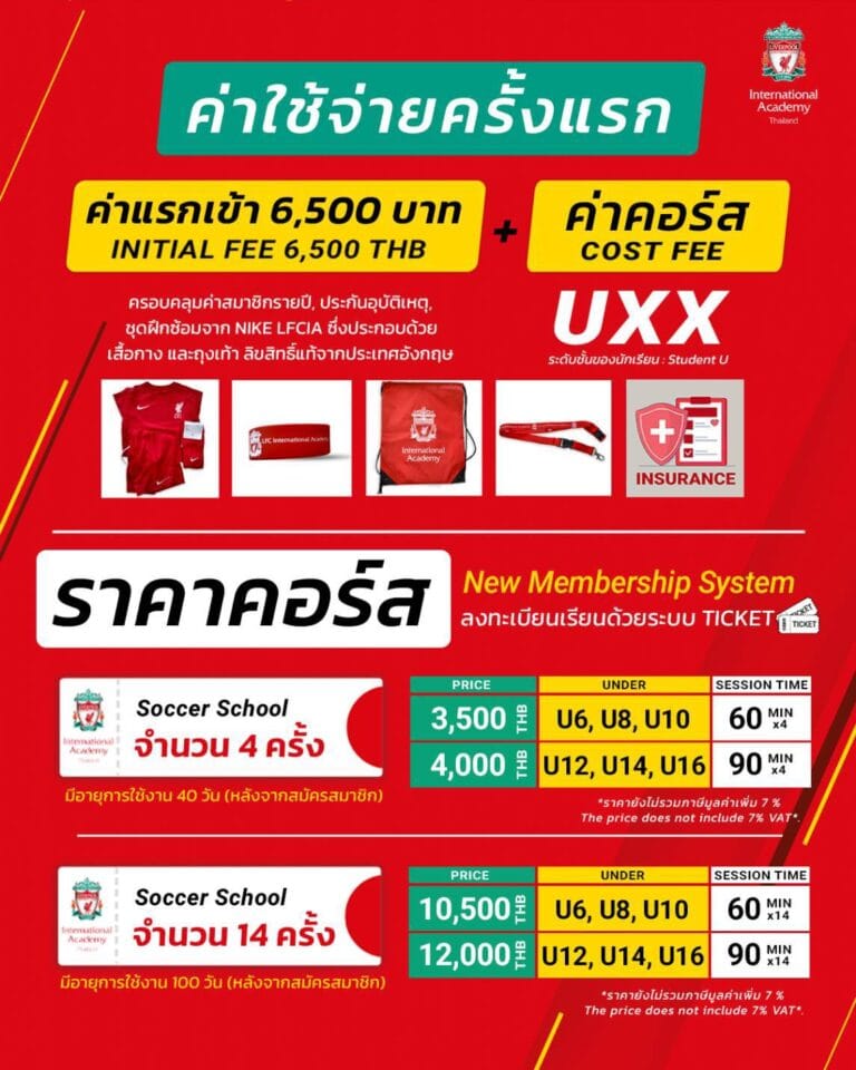 For New Members! Get 2,000 THB off the registration fee — pay only 4,500 THB instead of the regular 6,500 THB! Includes a full training kit: shirt, shorts, and socks from Nike LFC Academy. Terms & Conditions: This discount is available only to new members who register after May 1, 2025, at 09:00 AM.